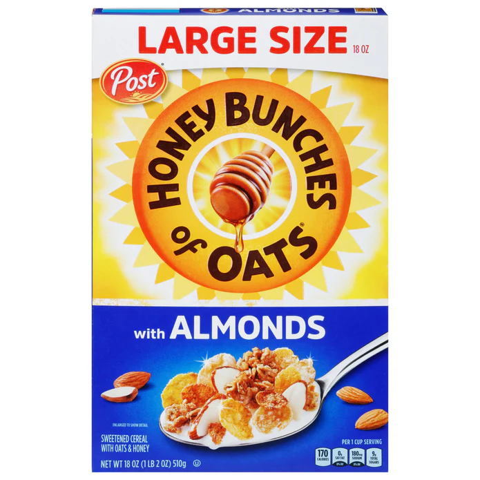 Sweetened cereal with oats & honey. Per 1 Cup Serving: 170 calories; 0 g sat fat (0% DV); 180 mg sodium (8% DV); 9 g total sugars. Whole Grain: 14 g or more per serving. Eat 48 g or more of whole grains daily. WholeGrainsCouncil.org. Contains bioengineered food ingredients. honeybunchesofoats.com. postconsumerbrands.com. Visit us at honeybunchesofoats.com. for information and puzzle solve! Visit us at: postconsumerbrands.com or call weekdays: 1-800-431-POST (7678) please have package available. This paperboard carton is 100% recyclable. Please follow your municipality’s instruction for recycling.